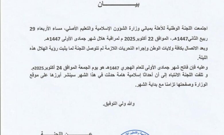 لجنة الأهلة تعلن الجمعة فاتح شهر جمادي الأولى