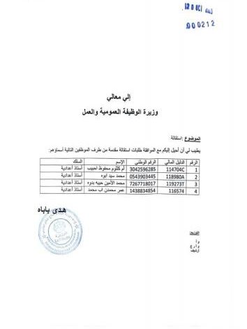 وكان عمر محمدن اب محمد، وهو أحد المدرسين الأربعة، قد أعلن استقالته من التعليم عبر رسالة موجهة إلى وزيرة التربية مطلع شهر أكتوبر الجاري.