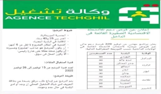 أعلنت وكالة تشغيل الشباب عن طريق برنامج مهنتي عن فتح باب الترشح للاستفادة من فرصة دعم مالي عبر قروض ميسّرة موجّهة لأصحاب الأنشطة الاقتصادية الصغيرة القاطنين في مدينتي “أطار و ودان” بولاية آدرار.
