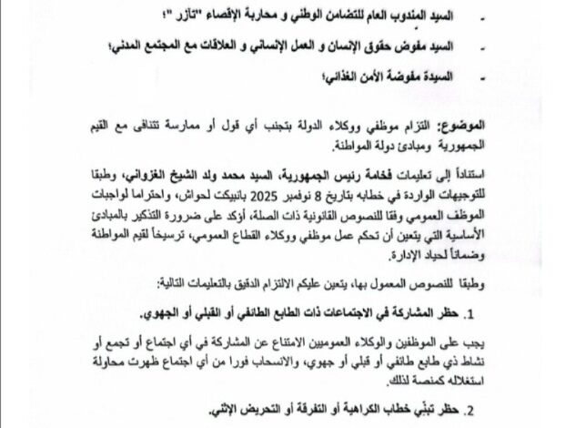 وأكد ولد اجاي في التعميم الصادر عنه أنه يتعين على موظفي الدولة ووكلائها الالتزام بالتعليمات المتعلقة بحظر الاجتماعات ذات الطابع الطائفي أو القبلي أو الجهوي، مشددا على أنه يجب عليهم الامتناع عن المشاركة في أي اجتماع أو تجمع أو نشاط ذي طابع طائفي أو قبلي أو جهوي، والانسحاب فورا من أي اجتماع ظهرت محاولات استغلاله كمنصة لذلك.
