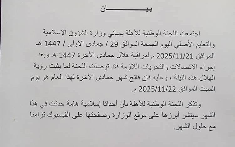 أعلنت اللجنة المركزية لمراقبة الأهلة ليل الجمعة/ السبت توصلها لما يثبت رؤية هلال شهر جمادى الآخرة من العام الهجري 1447.